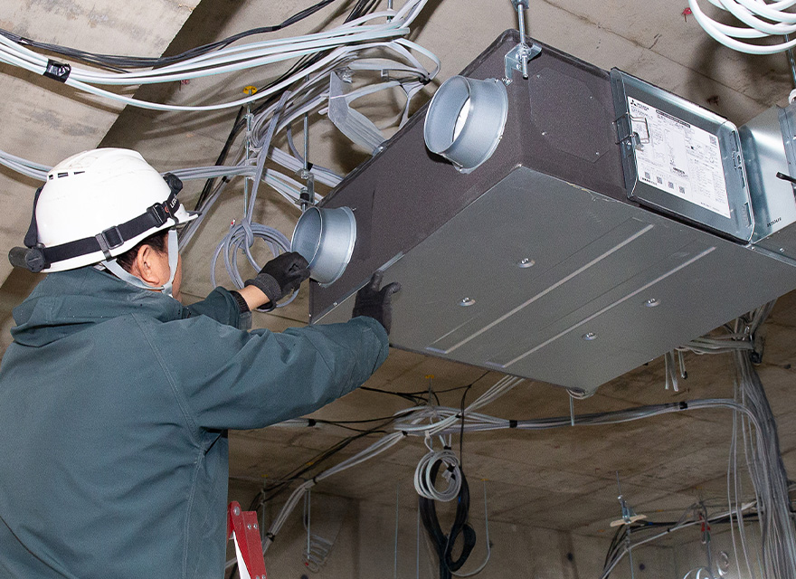 人が快適に過ごせる環境をつくることを目的とした設備です。 建物の室内環境における温度や湿度を適切にコントロールし、新鮮な外気を取り入れながら暖房・冷房・加湿・除湿を行います。ボイラーやエアコンといった熱源設備のほか、近年は地中熱を活用した省エネ型の冷暖房方式も採用しています。 また、食品工場などでは製品の加熱や冷凍・冷蔵といった温熱環境の制御も行い、幅広い分野に対応しています。